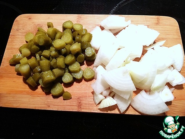 На сковороде в 1 ст. л растительного масла обжариваем лук до золотистости, добавляем соленые огурцы, заливаем 200 мл кипятка и, закрыв крышкой, даем потушиться 5 минут.