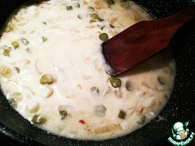 Тем временем смешиваем сметану с оставшимися 50 мл воды и мукой. На предмет сметаны - чем жирнее, тем вкуснее, но я ограничилась 10%. Добавляем к луку с огурцами, даем закипеть, проверяем на соль и, возможно, на сахар. Убираем огонь на минимум и даем протушиться минут 5-10, в зависимости от того, насколько хрустящими или мягкими хотим получить огурцы. Периодически помешиваем.