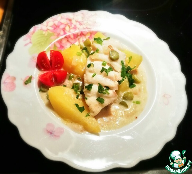 Подаем с вареной картошечкой, полив соусом и посыпав зеленью.