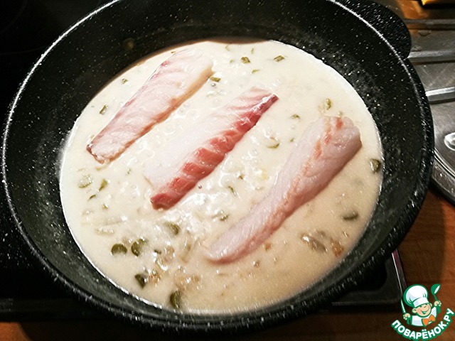 Добавляем в соус черный молотый перец и молотый тмин. Кладем куски рыбы, закрываем крышкой, через 3-4 минуты рыбу переворачиваем, снова закрываем крышкой и выключаем огонь. Даем постоять минут 5, за это время рыба сама дойдет и будет сочная, а не сухая.