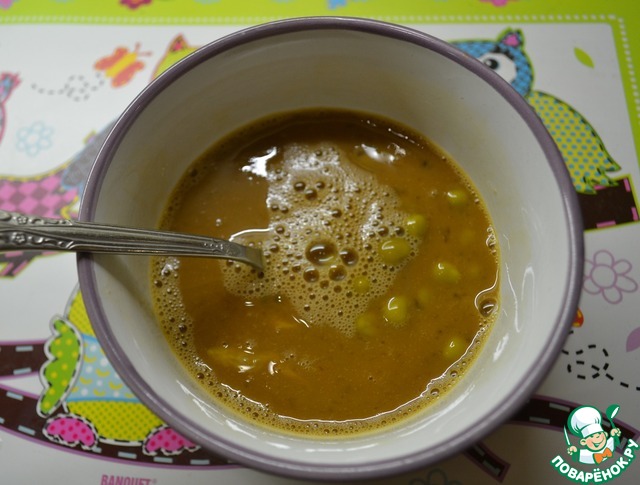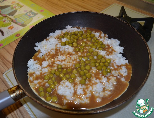 Добавить яйца с горошком. Постоянно помешивая, обжаривать еще 5 минут.