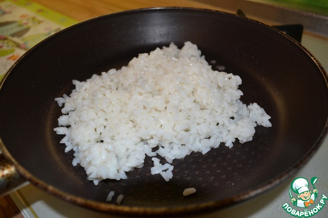 В сковороде разогреть растительное масло. Выложить рис и обжаривать на сильном огне, помешивая 3-4 минуты.