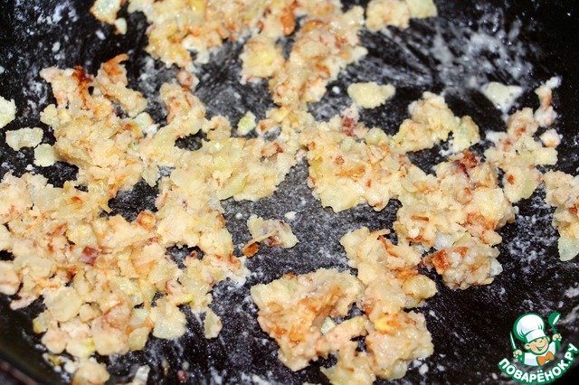 Лук обжарить, добавить муку и помешивая обжарить 2 минуты.