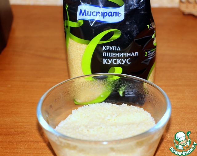 1/4 сткана кускуса ТМ Мистраль залить 1/2 стакана кипятка и оставить набухать на 10 минут.
