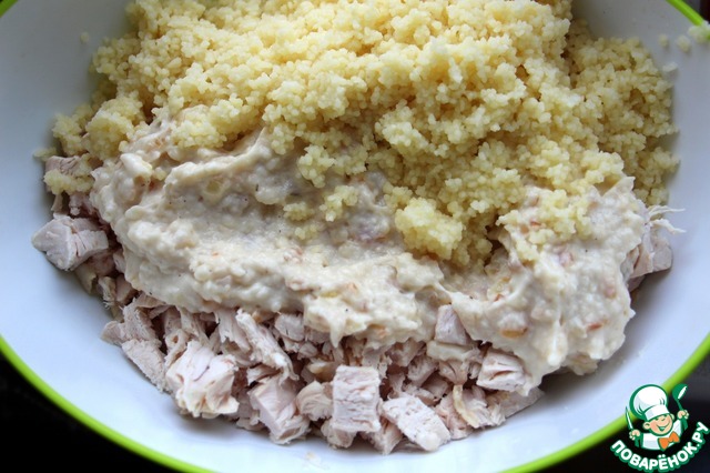 Грудку отварить, остудить, мелко нарезать, добавить к ней половину готового соуса и кускус. Перемешать, добавить соль, перец, чесночный порошок, перемешать.