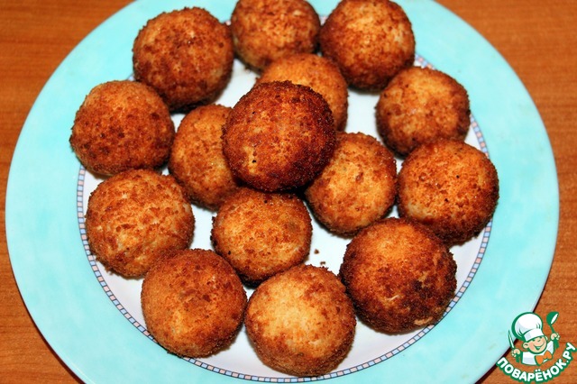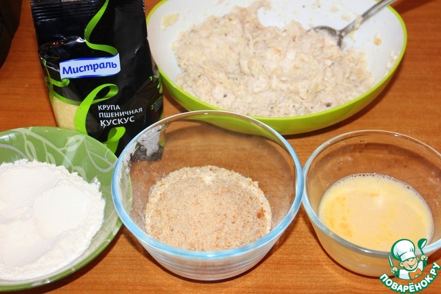 Из фарша делаем колобки, обваливаем в муке, яйце и сухарях.