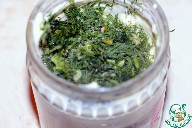 В оставшийся соус добавить чеснок, укроп, сметану и измельчаем блендером.