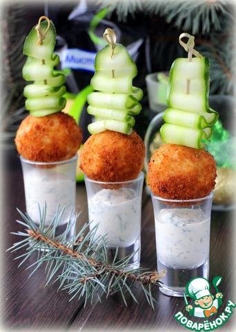 В рюмки выкладываем острый соус, сверху кладем сочный крокет, украшаем слайсами огурца.