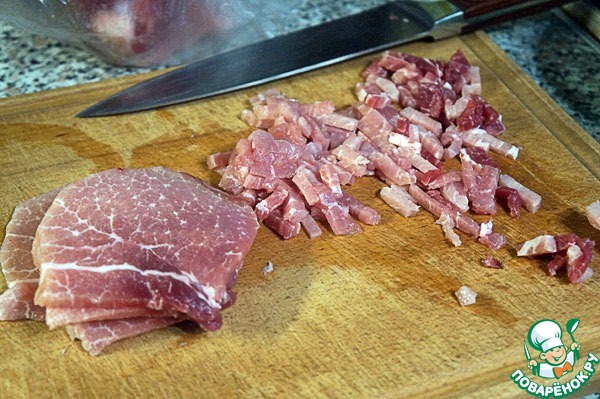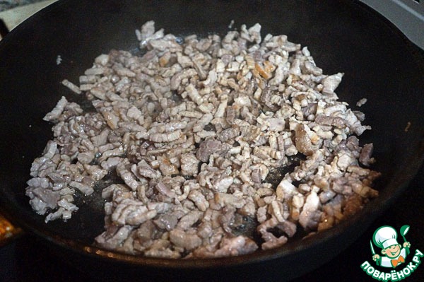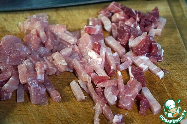 Свинину порезать очень мелко – у меня примерно 5 на 10 мм.