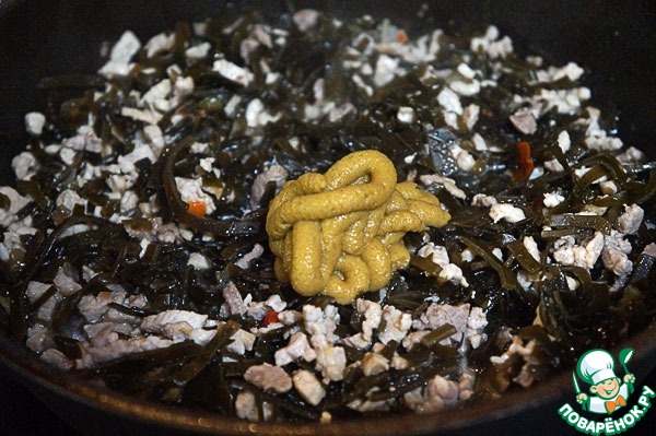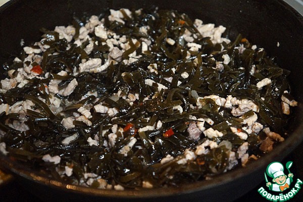 Выложить к мясу морскую капусту, перемешать, немного убавить огонь и хорошенько прогреть – минут 5.