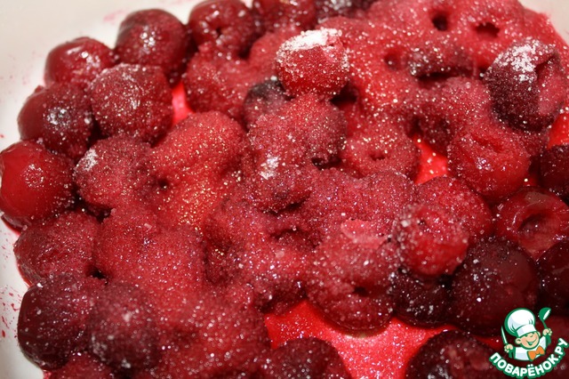 Если вишня с компота, то вишню отложить, а сироп смешать с сахаром, если сироп сладкий, то сахар уже не нужен.