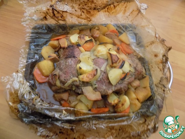 Выложила в рукав к мясу и завязала рукав с обеих сторон. Разместила на протвине. Поставила в духовку при т-180 С на 1,5 часа. Температура должна быть не более 200 С, т к пакет может лопнуть и сок вытечет.