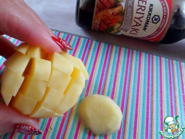 Картофель удобно для этого блюда взять круглый. Почистить его, срезать с одной стороны часть картофеля, для его устойчивости. Для удобства, поставьте картофель в ложку, срезанной частью и нарежьте его сверху вниз с одной стороны, затем разверните и нарежьте с другой, чтоб получилось как на фото. Нож будет доходить до краев ложки и не даст разрезать картофель насквозь. Или лежа, положить картофель на доску, нарезать так же с одной стороны, не доходя до края ножом, где у нас срез для устойчивости, а затем нарезать с другой стороны. Главное, чтоб он не распался.