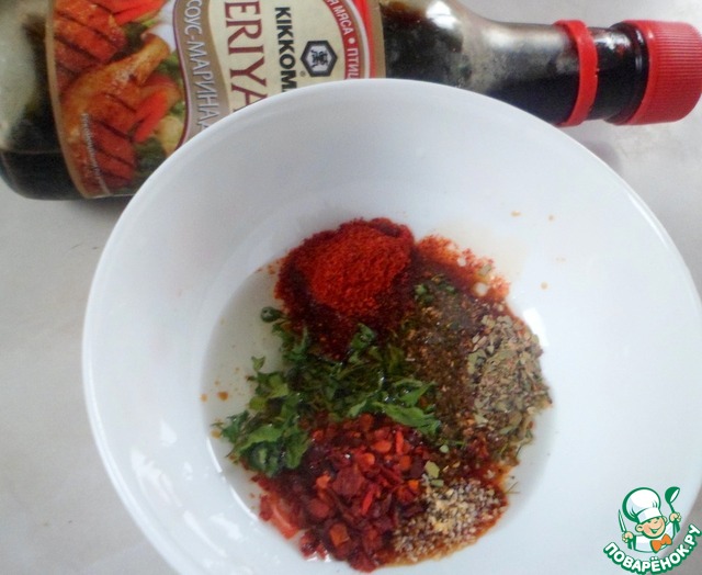 Перемешать все специи и приправы для картофеля, добавить соевый соус ТМ Киккоман и растительное масло. Тщательно перемешать.