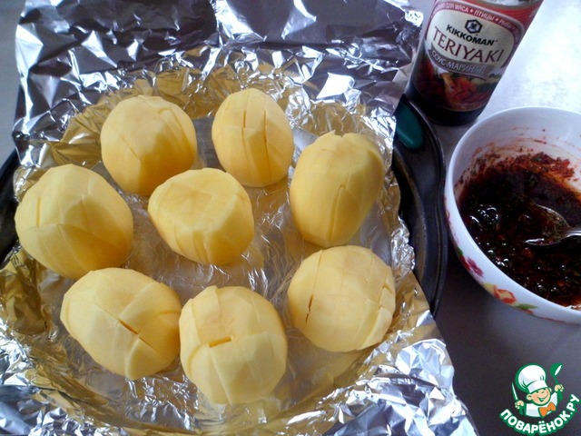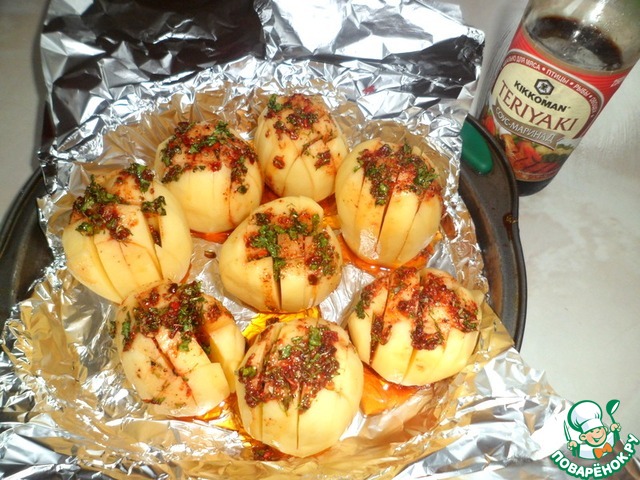 Очень осторожно, чтоб не поломать целостность картофеля, наполнить внутри и сверху приправой или маринадом. Накрыть фольгой и поставить в горячую духовку 170°C на 60-80 минут. Смотреть по сорту вашего картофеля. Какой быстро готовится, а какой нужно дольше подержать в духовке.