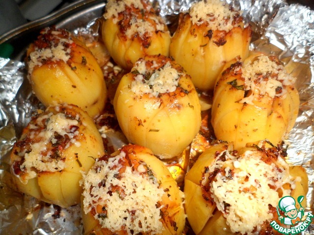 | Ни один праздник или застолье не обходится без картофеля. Хочу предложить вам очень ароматный и вкусный картофель. Необычная его подача, украсит ваш праздничный стол. Подавать картофель, как и любое блюдо из него -непосредственно перед едой, чтоб он был горячий. Ароматы и расплавленный сыр пленит вас. |