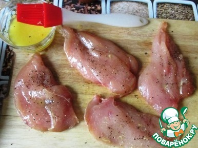 Филе чуть подсаливаем и посыпаем молотым черным перцем.