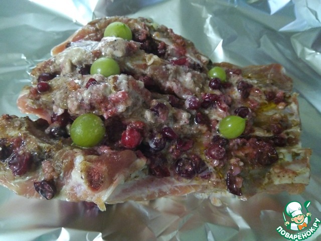 Мясо порезать гармошкой, посолить. Клюкву размять вилкой и смешать с маслом и специями. Смазать мясо, крыжовник вставить в разрезы, завернуть в фольгу и оставить мариноваться на ночь в холодильнике.