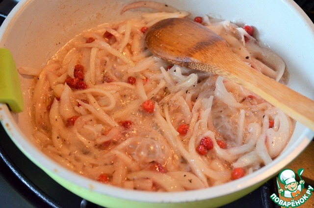 Выложить в мясо лук, бруснику,