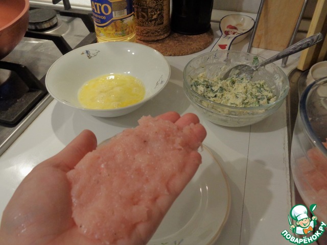 Далее на середину фарша выкладываем 1 чайную ложку нашей начинки.