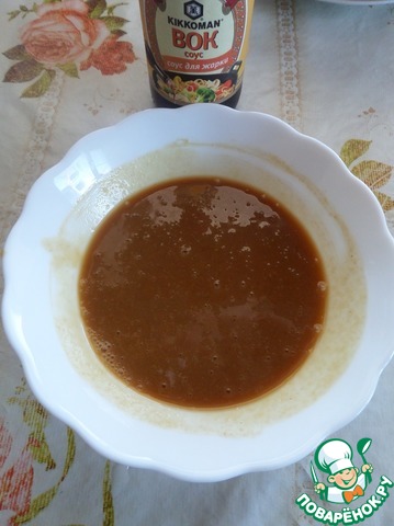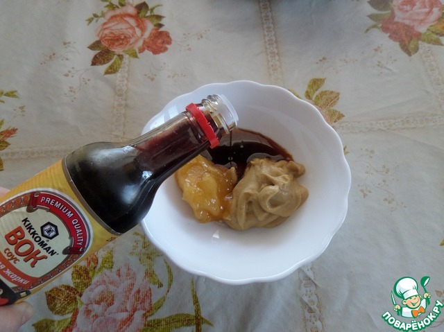 В чашечку выкладываем мед, горчицу и соль. Добавляем соус для жарки "ВОК" ТМ "Kikkoman".