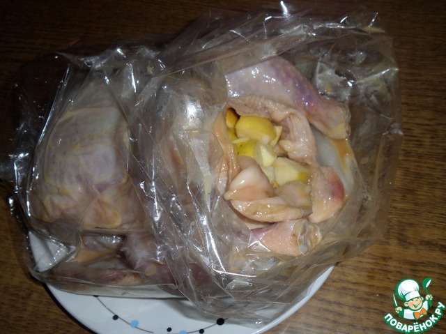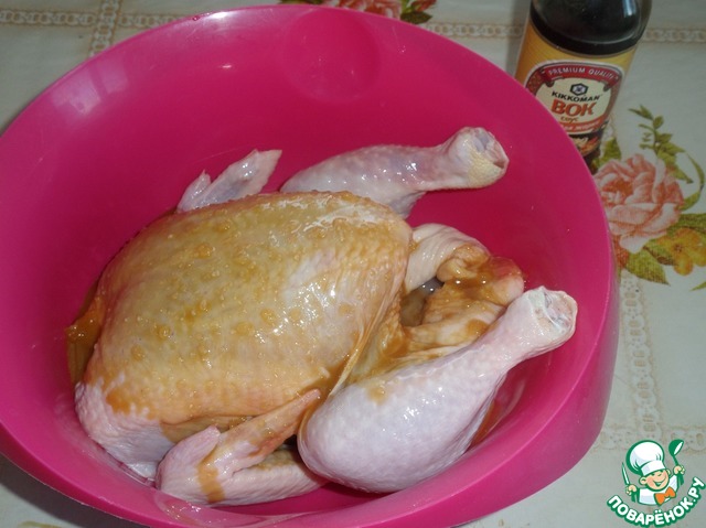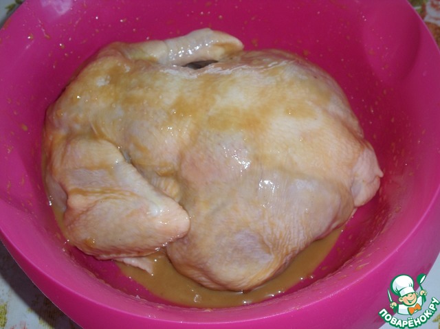 В глубокую чашку кладем промытую водой и обсушенную бумажными полотенцами курочку. Добавляем приготовленный маринад и равномерно распределяем его внутри и снаружи птицы.
