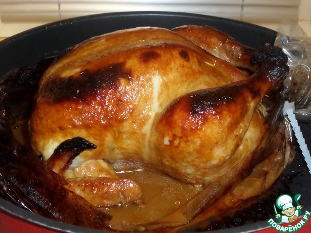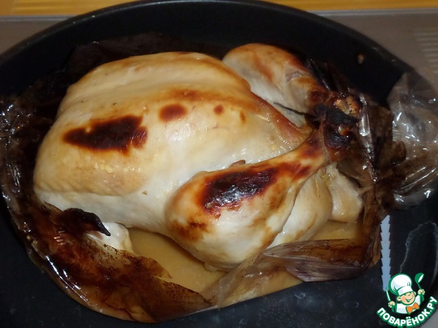 Затем пакет раскрываем. Запекаем курицу еще 20-30 минут при 180-200 градусах, поливая птицу выделяющимися соками.