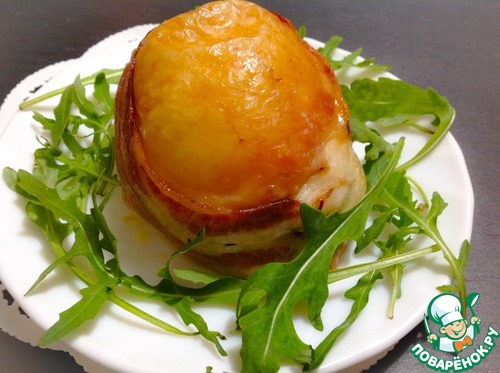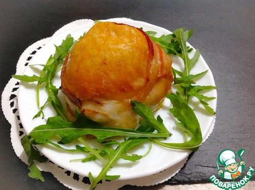 На середину выложить начинку. Аккуратно сформировать мешочек, начинкой внутрь. При необходимости закрепить зубочисткой. Обернуть полоской бекона, скрепить зубочисткой. Колобки выложить на противень и запекать в разогретой до 200С духовке 50-60 минут. Кожа должна приобрести красивый золотистый цвет.