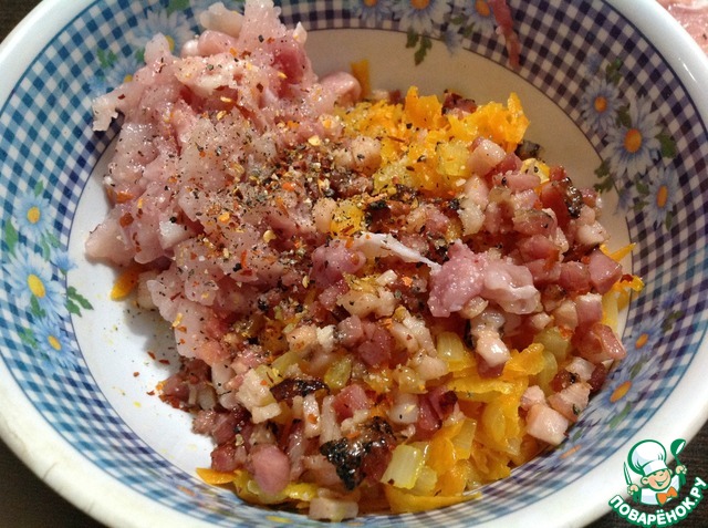 Куриное мясо смешать с морковью, луком, соевым соусом (я использовала соевый соус ТМ Киккоман), мелко нарезанной копчёной грудинкой и специями. Поперчить и посолить по вкусу.