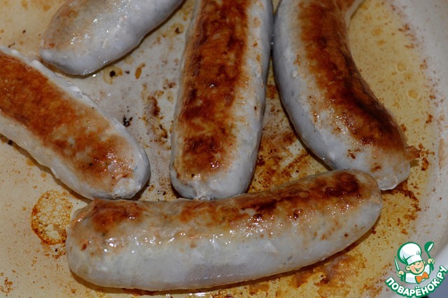 Обжарить купаты в смеси растительного и сливочного масел до золотистого цвета. Переложить в тарелку.