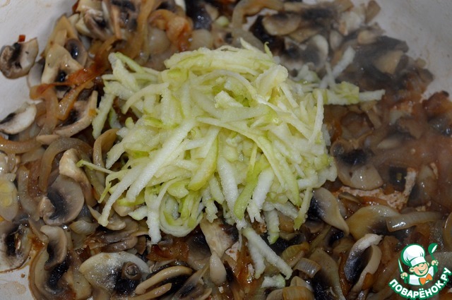 В этом же масле обжарить лук и грибы, добавить яблоко, натертое на крупной терке. Жарить на малом огне 5 мин.