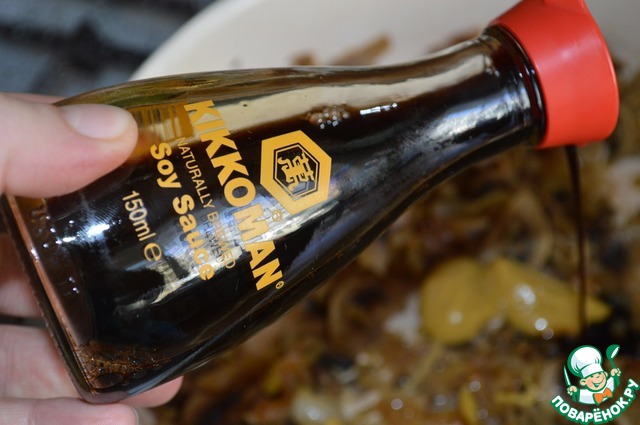 Добавить горчицу, соевый соус и молотый черный перец, перемешать.