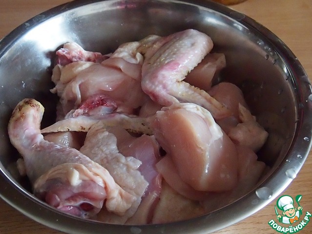 Целую курицу разрезать на куски - крылья, бедра, голени, грудку кусочками, а спинку напополам (или спину и шею можно оставить на супчик).
