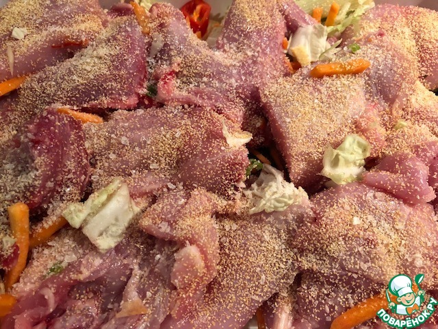 Нарежьте кролика. Положите в лоток с овощами и перемешайте.