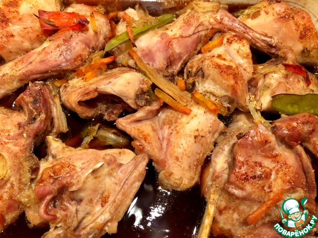Накройте фольгой и убирайте в разогретую до 200 С духовку. Кролику нужно время, чтобы стать мягким. Готовим полтора часа под фольгой.