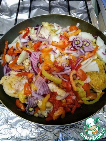 Курицу слегка обжарить с хмели-сунели и луком, болгарским перцем, посолить. Можно прям в мультиварке это сделать, я делала на сковороде.