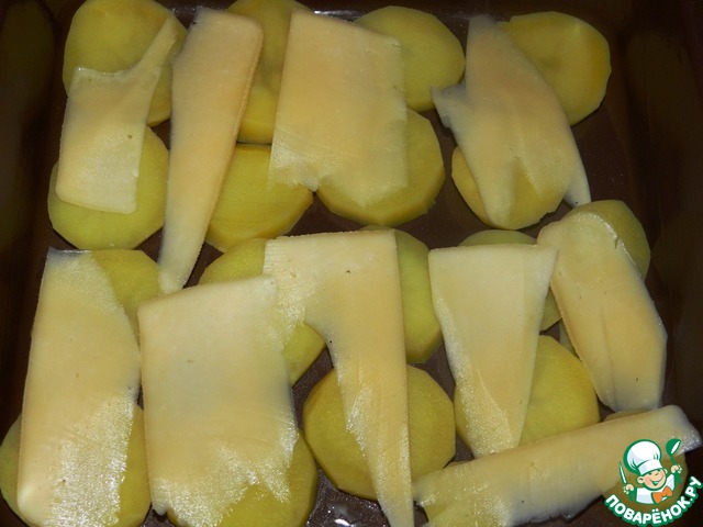 Пока варится картошка, тонко режем сыр. Форму для запекания смазать сливочным маслом. Выложить слой картофеля, на него сыр.