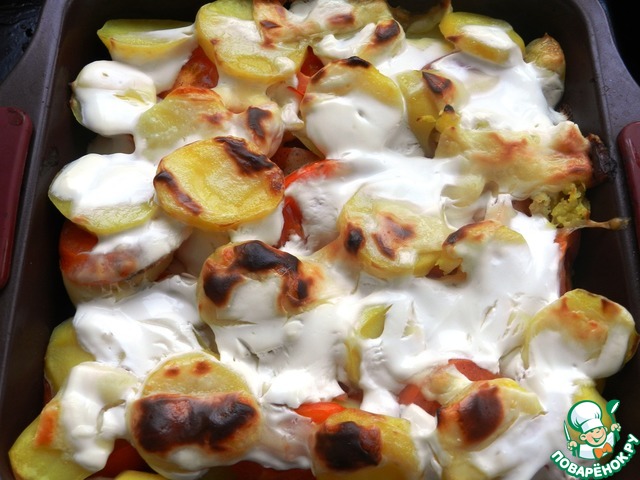 Далее слои повторяются. Последним должен быть картофель, смазанный сметаной.