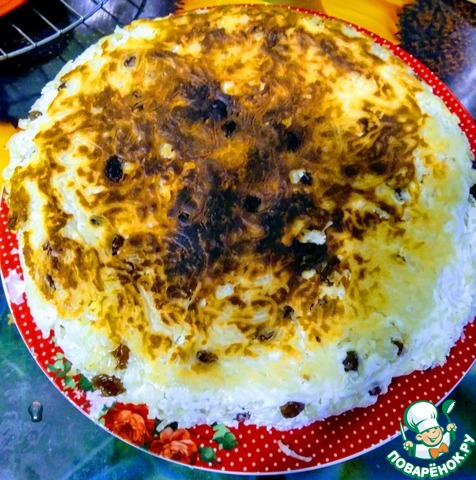 Макароны отварить до готовности, добавить в творожную массу вместе с сливочным маслом, изюмом и ванилином. Изюм я запаривала.