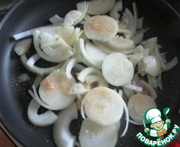 Оставшийся лук нарезаем кольцами или полукольцами, выкладываем на сковороду со столовой ложкой топленого масла, или иного животного жира, засыпаем сверху коричневым сахаром и обжариваем до красивого красноватого цвета.