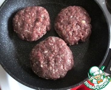 Фарш тщательно вымешиваем, втирая тертый лук в мясо. Потом собираем мясо в ком и с силой бросаем обратно в миску, - так мы его отбиваем. Сию процедуру проделываем раз 10. Лепим из фарша 3-4 круглых бифштекса, диаметром 12-15 см и толщиной 1-1,5 см. Оставляем их на доске отдохнуть
