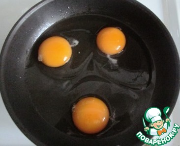 Нам осталось поджарить яйца для подачи. Ставим сковороду на НЕБОЛЬШОЙ огонь, добавляем оставшееся топленое масло. Как только масло начнет таять и растекаться по сковороде, выпускаем яйца, по одному яйцу на порцию, стараясь не повредить желток. Жарим на малом огне 5-7 минут.