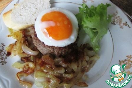 Выкладываем бифштекс на тарелку, вокруг выкладываем карамелизованный сладкий лук, а сверху укладываем яйцо. Красиво? А то...