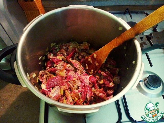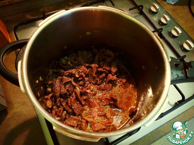 Добавляем говядину, посолили, поперчили, добавили карри. Обжариваем до тех пор, пока мясо не получит коричневый цвет со всех сторон. Затем заливаем мясо 250 мл воды. Потом пароварку/скороварку закрываем и тушим 30 мин.