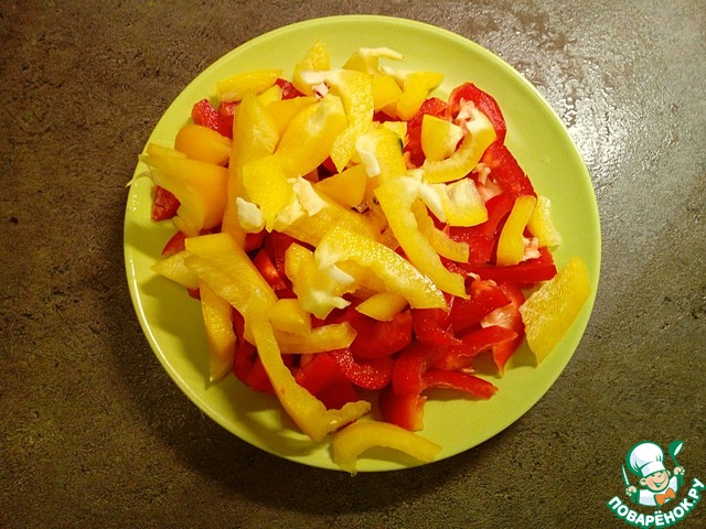 Пока говядина тушится, нарезаем соломкой болгарский перец.