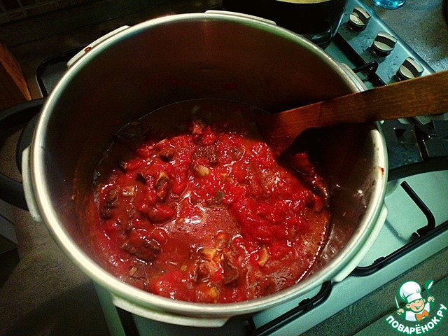 Теперь ставим на маленький огонь, добавляем томатную пасту, соевый соус и помидоры (если вы используете свежие, то в миске их залейте кипятком, снимите кожуру и нарежьте).