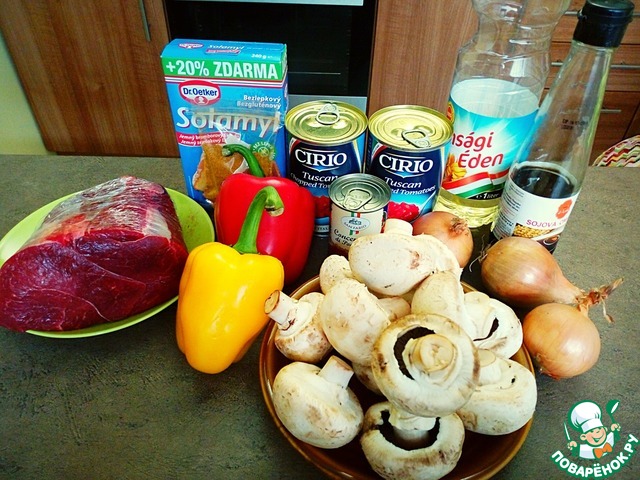 Добавляем к мясу болгарский перец и шампиньоны, опять посолили и поперчили, подлили 250 мл воды. Тушим следующих 15 минут.