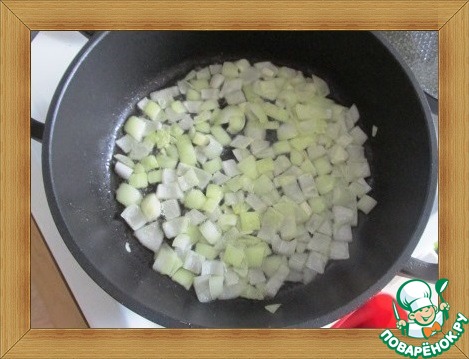 Разогреваем сковороду с маслом, выкладываем лук и обжариваем до мягкости минуты 4.