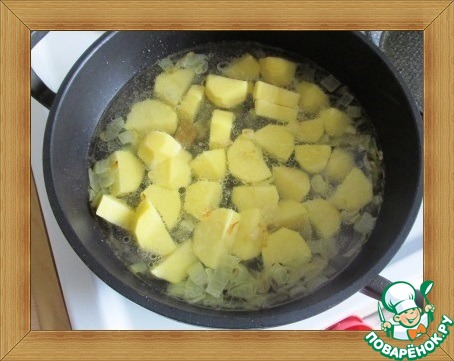 Выкладываем к луку картошку, заливаем водой, солим и кидаем 1-2 листика лаврушки. Накрываем крышкой, доводим до кипения и варим 20-25 минут до полной мягкости картошки. Если картошка предназначена именно для варки, то она уже должна частично терять свои четкие очертания, т. е. развариваться. Мне попадалась упрямая картошка, до последнего хранила верность форме. Но мы её победим другим путем...