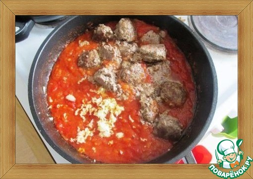 В соус вываливаем тефтельки и пропущенный через пресс чеснок.